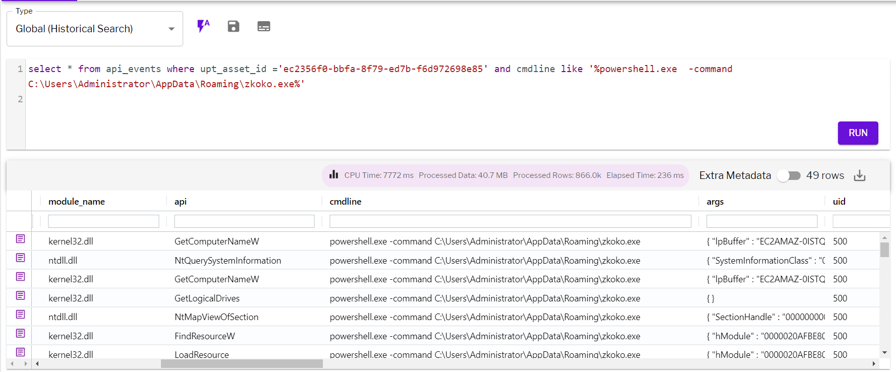 select * from api_events where upt_asset_id ='ec2356f0-bbfa-8f79-ed7b-f6d972698e85' and cmdline like '%powershell.exe -command C:\Users\Administrator\AppData\Roaming\zkoko.exe%'
